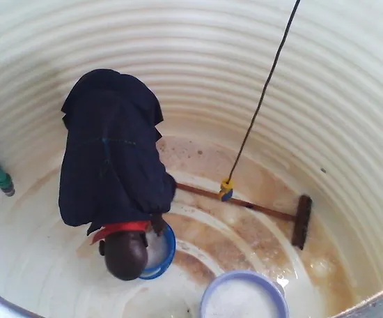 - تبدأ خطوة فرك وتنظيف جدران الخزان والأرضية والسقف بشكل دقيقة بادوات مناسبة لا تخدش أو تضر بالخزان.